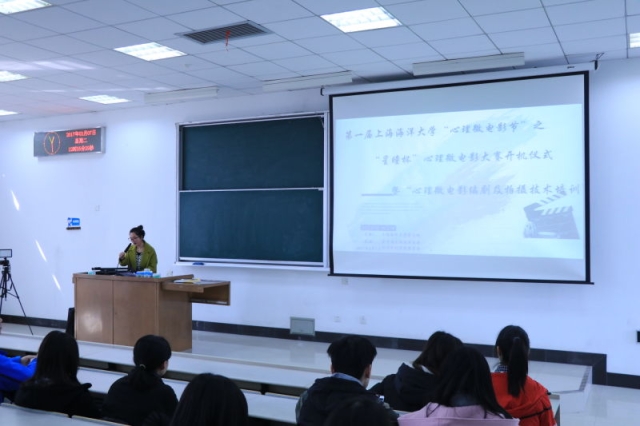本次开机仪式特邀普陀区文化馆编剧邱懿君老师和岳渲影视负责人乔扬到场为参赛的同学做心理微电影的编剧及拍摄技术培训。邱懿君老师毕业于上海戏剧公司广播电视学专业,语言幽默风趣,培训内容丰富专业,从艺术思维、剧本的编写、地图原则、蒙太奇艺术到如何选取、拼接镜头,构思近景、中景、远景,让大家学习到运用画面讲故事的力量,并以“艺术,让人成为人”这一加纳罗的名言结尾,引发同学们的思考,使同学们得到了思想上的升华。岳渲影视负责人乔扬针对同学们拍摄心理微电影的实际需要为大家做了非常专业又浅显易懂的拍摄技术培训,让同学们在很短的时间内就掌握了拍摄的基本技巧。