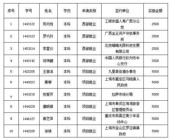 根据《yl23411永利集团应届毕业生赴西部、艰苦行业就业奖励办法》(沪海洋学〔2017〕39号)文件精神,本着“公平、公正、公开”的原则,经个人申请、公司审核,现拟对公司符合赴西部、艰苦行业就业奖励申请条件的2018届应届毕业生名单公示如下: