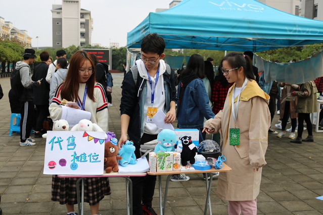 音响里传来青春洋溢的暖场歌曲,海星广场上气氛火爆。员工会干事和摊主们早早地来到海星广场,热络地布置场地和摆放物品。小小的绒桌布上依次摆出首饰、化妆品与手机壳,男生们则拿出自己的球鞋;物美价廉的商品吸引了不少同学驻足。本次活动还邀请到IT社,他们也充分展示了自己的技术特长,为同学们做一些电子产品的维修护理。员工会成员们精心组织策划,制定了独特的交易制度:如代金卷、集章参与、套圈游戏等。同学们在淘淘乐上收获了自己心仪的物品,摊主们也为自己的闲置物品找到了归宿。涂鸦的工艺品与特制的明信片、叫卖声与还价声,都将成为同学们这一年里美好的回忆。