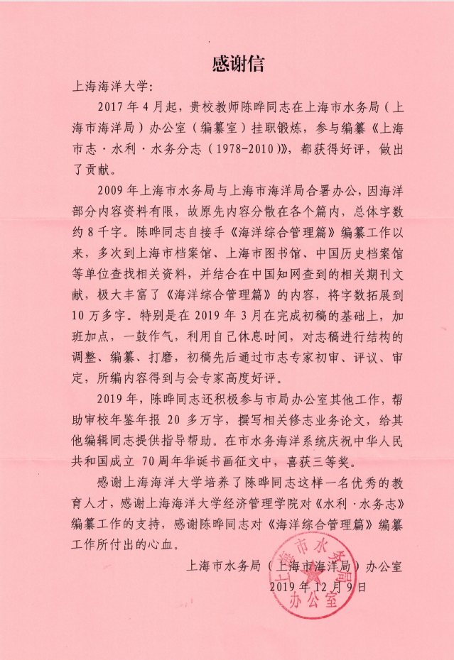 近日,公司收到来自上海市水务局的感谢信。信中感谢yl23411永利集团陈晔在上海市水务局(上海市海洋局)办公室(编纂室)挂职期间参与《上海市﹒志水利﹒水务分志(1978-2010)》的编纂工作,陈晔在挂职期间秉承“勤朴忠实”的校训精神,勤恳踏实、兢兢业业,展现出海大青年教师、学者的良好风采。