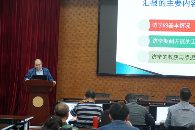 会议第二个议程,韦有周老师进行“英国Heriot-Watt大学游学汇报”。通过本次游学,韦有周老师坚定了“四个自信”,在科研方面得到了磨炼,拓展了国际视野。