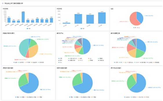 好的经验一定要分享,如今yl23411永利集团教务王强老师将使用经验分享给兄弟公司,好几位兄弟公司教学经理主动添加王强老师微信进行请教。教务处也积极引入王强老师的在线管理经验推广到很多方面,例如:经管公司秘书王强老师受托制作了“课程在线教学前基本情况”摸底在线表格,自2月15日对全校本科生开展问卷调查,短短数天时间,获取数据12169条,占全校在籍本科生数的98.8%,对于同学手边是否有电脑、是否有智能手机、是否能上网学习等情况有了基本了解,为下一步公司在线教学的开展提供了重要员工支持依据。此后为了了解在线教学开始后,员工的反响如何,现有的在线教学有什么不足之处,有哪些喜欢的教师和课程,教务处也委托王强老师一起制作了相应的表单来收集同学们的反馈,并且通过“简道云”提供的仪表盘功能,实时展现分析结果,以便公司、公司领导做出正确决策,后台数据见图2。