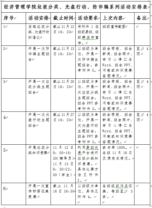 经济管理特组织开展垃圾分类、光盘行动系列主题活动,请各班积极组织参与,具体安排如下: