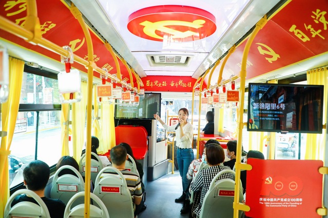 党史学习教育巴士从中共一大会址出发,途经中共二大会址、五卅纪念碑等一系列党史重要事件节点的建筑物,最终停在浦东开发开放30周年主题展览馆,将上海珍贵的红色资源串点成线。100分钟党史课程包括“中共一大开天辟地”“历史为什么选择上海”“中共二大建章立制”“中共四大强化组织”等12大板块、30分钟视频资料和40多个党史故事,生动展现了中国共产党领导下国家的繁荣与发展,深刻回答了“中国共产党为什么能”“马克思主义为什么行”“中国特色社会主义制度为什么好”。
