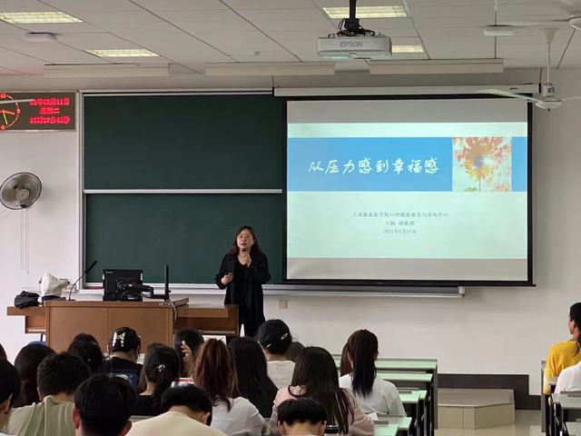 讲座伊始,王老师先是让我们做了一个有趣的小测验来测试我们的压力值,又让我们给自己现在的生活幸福值打分。王老师循序渐进,逐步引导,带领同学们了解自己的压力感。