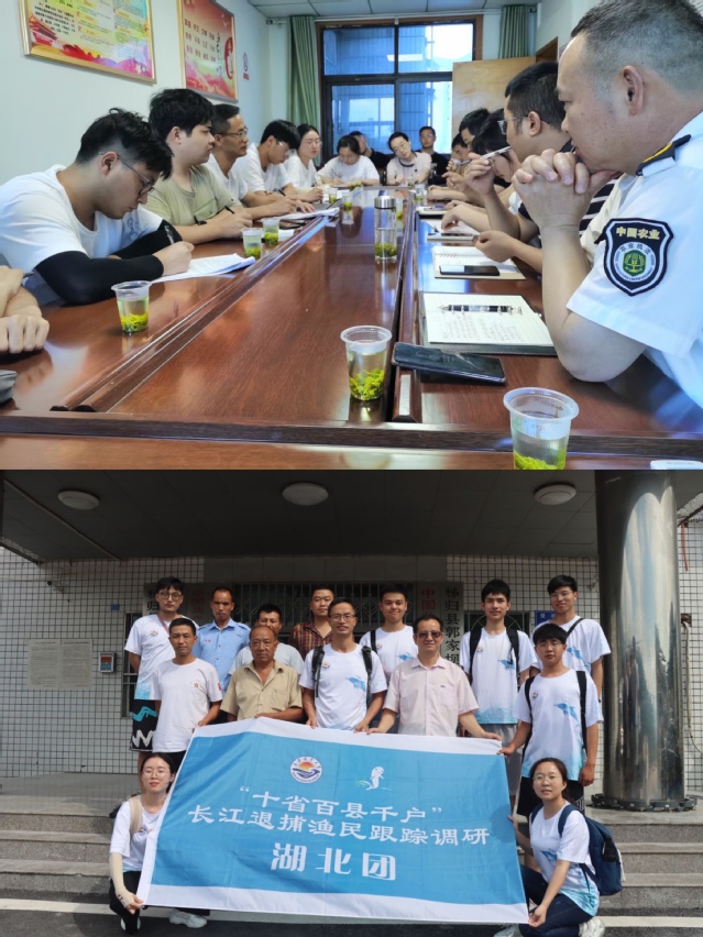 调研团还深入石首市、赤壁市进行调研,顺利开展问卷调研、座谈交流等工作。调研团最后一站来到武汉市江夏区进行调研。这里的退捕渔民有部分从昔日的捕鱼者转变为今日的护鱼员,他们身着白衣黑帽,巡游在宽广的长江水域之上,协助渔政队伍加强水上执法,昼夜守护长江。