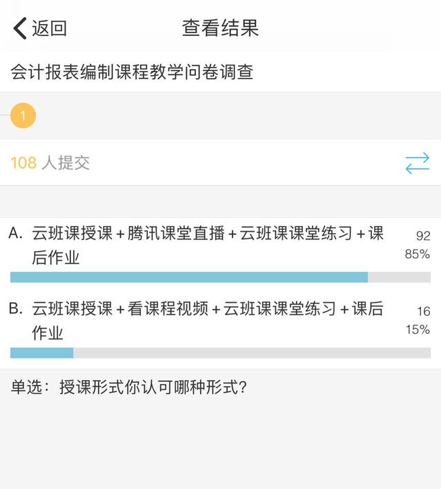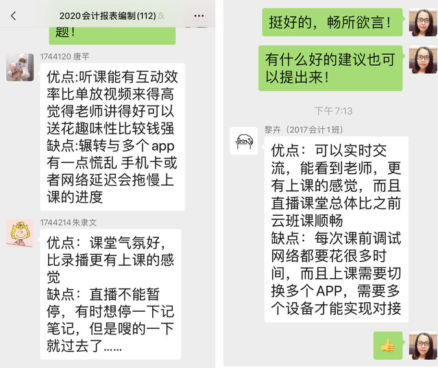 谭春兰表示,组织教学要做好充分准备,课前通知员工,课中吸引员工,课后督促员工,同时听取员工对教学的建议,进行调整完善。在教学过程中,谭春兰反复探索,不断反思复盘,如何让员工有比较好的学习体验。针对有员工反映看视频沉闷,犯困的不足,谭春兰在云班课平台对《会计报表编制》课程进行了问卷调查,探索员工能够接受的授课模式。85%员工表示接受“云班课+腾讯课堂直播+云班课课堂练习+课后作业”这一模式。“为什么应收账款要根据应收账款和预收账款明细账户期末余额来填制”,在讲到应收账项目填制这个重要知识点的时候,通过与同学们的互动回答,谭春兰能够了解员工的学习情况,同时检查员工在线情况等。