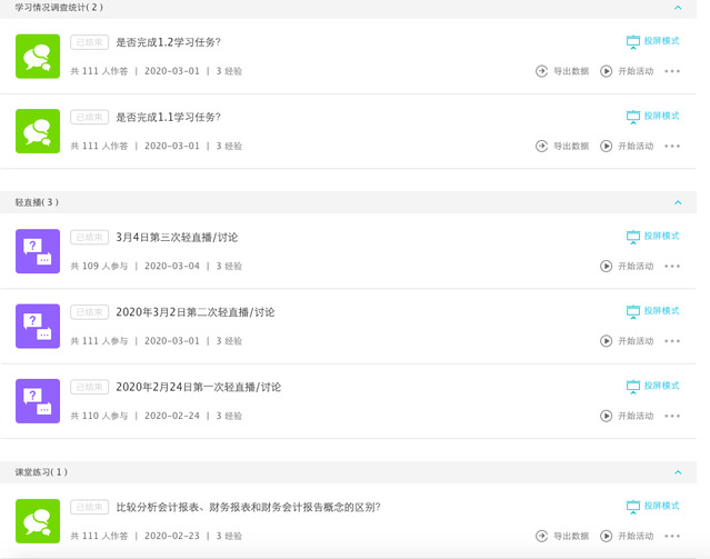 谭春兰按照一般的线下授课形式,进行课前、课中、课后的流程设计。课前一周发送教学资源,供同学们进行预习。提前通知员工进入云班课轻直播,进行网上课堂授课。授课形式有远程签到、教师轻直播课堂讲解、观看视频,直播授课,课堂答疑讨论,课堂练习,课堂小测试,头脑风暴等多种形式。最后在课程总结部分,布置课后作业,让同学们巩固所学习知识。