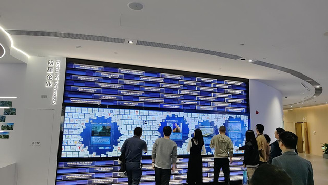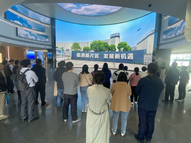 滴水云厅位于临港新片区滴水湖北岛内西侧,场馆面积8000余平米,是临港新片区最重要的对外招商展示平台和滴水湖畔的又一地标建筑。在讲解员的介绍下党员们分别参观了展厅内的“源、潮、港、湃、湾”五个单元。位于展厅二楼幸福港湾展区内的两幅LED弧形数字长卷,更是将临港新片区的交通、生态、居住、教育医疗、公共服务、商文体旅、数字能源等一系列新城地标有机布局,采用都市卡通风动画循环展现以环滴水湖核心片区为视野的智慧生态、宜业宜居的《幸福港湾》画卷。