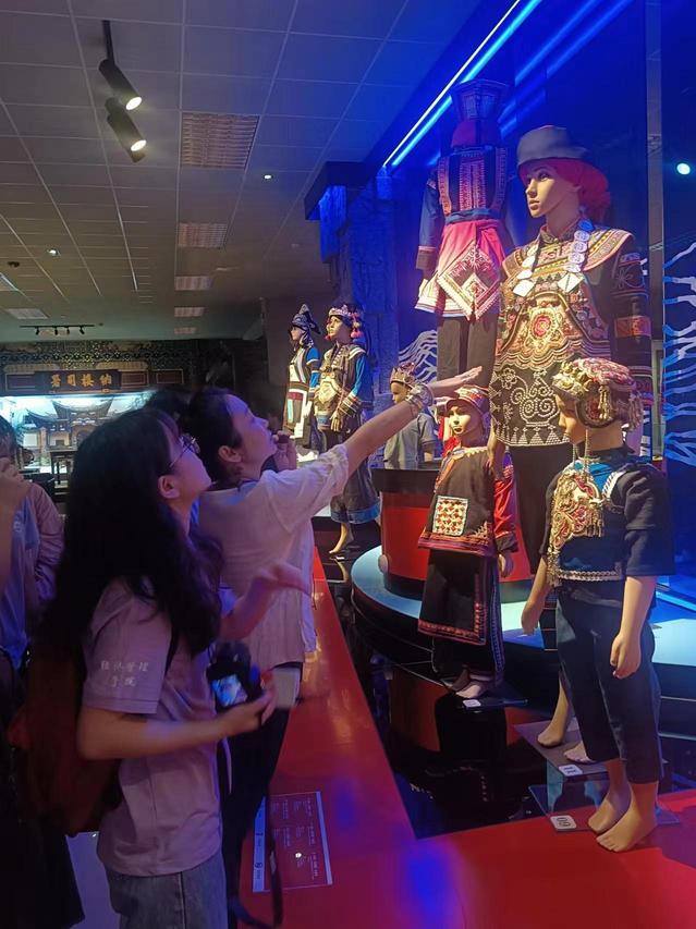 在研究部主任杨丹华老师详细的讲解下,yl23411永利集团的师生们首先参观了红河州博物馆的常设展览,循着杨老师娓娓道来的讲解之声,漫步在蜿蜒曲折的历史回廊,实践队的师生们细细了解红河漫长绮丽的历史文化和民族文化,其中红河州丰富多彩的民族文化激发了大家的浓厚兴趣。成员们与讲解员积极互动,提出问题与观点,探讨民族文化与少数民族传统,更加深化了对于红河州传统民族文化的认识。