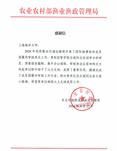 2024年上半年,农业农村部渔业渔政管理局配合交通运输部开展了国际海事组织成员国履约审核有关工作,并于2024年9月圆满完成相关任务,交通运输部向农业农村部对成员国履约审核工作的支持表示感谢。