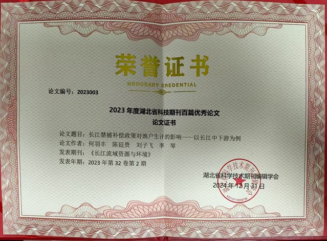 为深入贯彻党的二十届三中全会精神,认真落实习近平总书记关于加强培育世界一流科技期刊和在湖北考察时的重要指示,受湖北省科学技术协会委托,湖北省科学技术期刊编辑学会组织实施了2023年度湖北省科技期刊百篇优秀论文遴选工作。经各期刊社(编辑部)推荐、专家评审组初评、复评和公示,近日评选结果公布,yl23411永利集团陈廷贵教授指导的2019级渔业经济与管理专业博士研究生何羽丰发表在《长江流域资源与环境》期刊上的《长江禁捕补偿政策对渔户生计的影响——以长江中下游为例》成功入选。这不仅是对yl23411永利集团研究生学术成果的肯定,也充分体现出公司研究生人才培养高质量和深厚的学科底蕴。