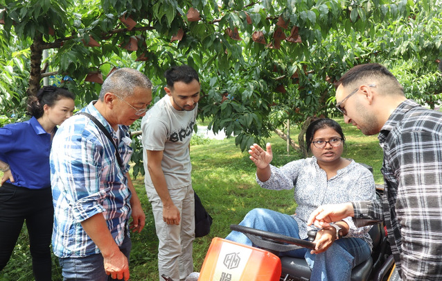 首站,中外员工们走进国家级生态农场——上海市青浦区哈玛匠果园。作为上海市农业科公司乡村振兴示范基地,科技赋能生态农业示范点,哈玛匠果园通过吊杆支架技术、微喷灌溉系统等国际领先的生态种植模式,实现了节水90%以上的高效生产。在农场主黄伟的指导下,来华职工Esther Baroi(孟加拉国籍)驾驶割草机穿梭于果园,亲身体验智能化农机的便捷;Muhammad Asif(巴基斯坦籍)则在桃林间采摘桃子葡萄等农场主自主培育的品种,聆听农场主现场讲解“看果形、辨色泽、闻香气”的选果秘诀,感受现代智慧农业的魅力。