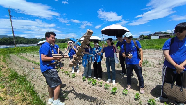 本次海外实践课程将“课堂”设置在生态农场第一线,抛弃传统的走马观花,转向深度参与。在实训过程中,员工不畏38度的高温酷暑,在烈日下亲手操作设备。振荡除草犁,这是农场主古野隆雄博士改良的一种体现生态理念的行间除草机器,它不仅对旱田水稻非常有效,而且对各种蔬菜、小麦、玉米等作物也同样有效。徐宇航举起除草犁,俯身操作,通过观察发现,改装后的工作头可以有效深入10厘米根部,除草效率提升70%。