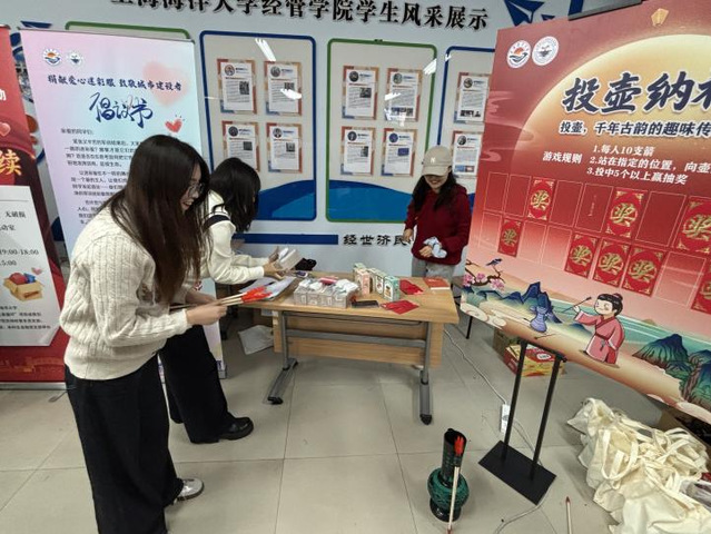 专题分享结束后,活动进入轻松愉快的投壶游戏环节。参与者凝神投矢,壶中箭影穿梭,欢声笑语不断。游戏不仅展现了传统投壶的雅趣,也寄托了学子对未来的美好期盼。同学们在体验传统文化的同时,也增进了彼此之间的交流与情谊。